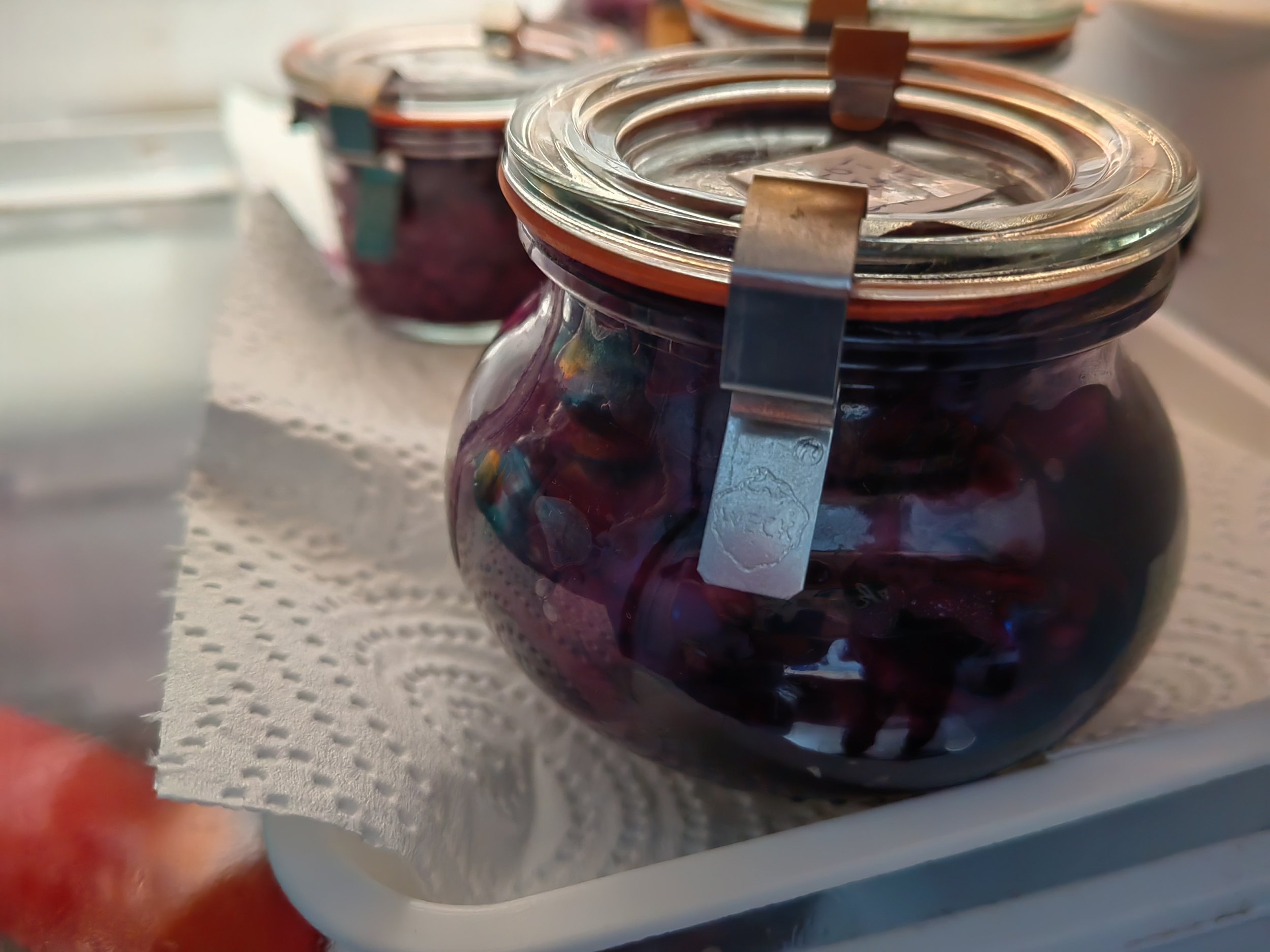 Das Glas sollte gut befüllt sein, die Rotkrautblätter zum Beschweren nehmen und zusätzlich noch einen Glasdeckel oder ein Glasgewicht zum Beschweren verwenden.